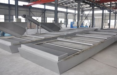 鏈板式回轉(zhuǎn)式格柵除污機(jī)為粗格柵,又稱雨水格柵、反撈式格柵,是一種用于清除水中較大固體懸浮物的大型粗格柵設(shè)備,本裝置可以連續(xù)自動(dòng)清除液體中的固體懸浮物,設(shè)計(jì)合理、結(jié)構(gòu)簡(jiǎn)單、運(yùn)轉(zhuǎn)安全、可靠、自動(dòng)化程度高,可廣泛應(yīng)用于城市污水處理、自來(lái)水廠取水口、雨水泵站、發(fā)電廠冷卻水取水口等大流量的水處理場(chǎng)所。設(shè)備機(jī)架結(jié)構(gòu)參照了回轉(zhuǎn)式格柵除污機(jī)的優(yōu)點(diǎn),采用與眾不同的工作原理,即耙齒鏈在柵條前后作回轉(zhuǎn)運(yùn)動(dòng),到耙齒運(yùn)轉(zhuǎn)到柵條的迎水面時(shí),即插入柵條縫隙中由下往上作清撈動(dòng)作。耙齒鏈采用封閉式,不讓雜物侵入,使設(shè)備運(yùn)轉(zhuǎn)更加平穩(wěn)。設(shè)備安裝時(shí)整機(jī)吊裝,只需在集水井兩側(cè)的地坪上預(yù)埋兩塊鋼板,土建簡(jiǎn)單節(jié)約,安裝維修方便。